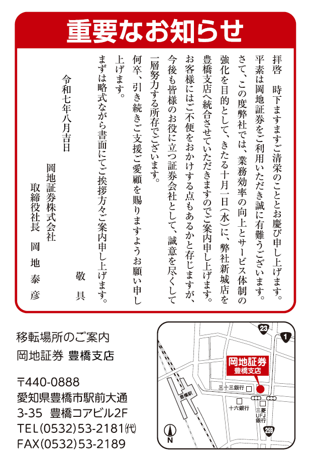 新城店は、きたる10月1日(水)に下記の通り、豊橋支店と統合させていただきます。